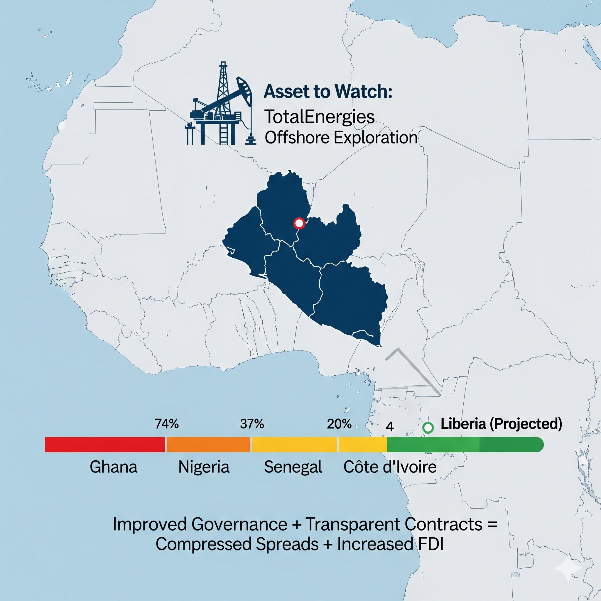 Liberia’s anti-corruption drive shows momentum—CPI 27/100, Afrobarometer approval 54%—but markets want follow-through. Track peer curves (GHANA 2032, NGERIA 2031, SENEGL 2033, IVYCST 2032) and sector catalysts (TotalEnergies LB-6/11/17/29). When cases mature, spreads compress—if institutions hold.