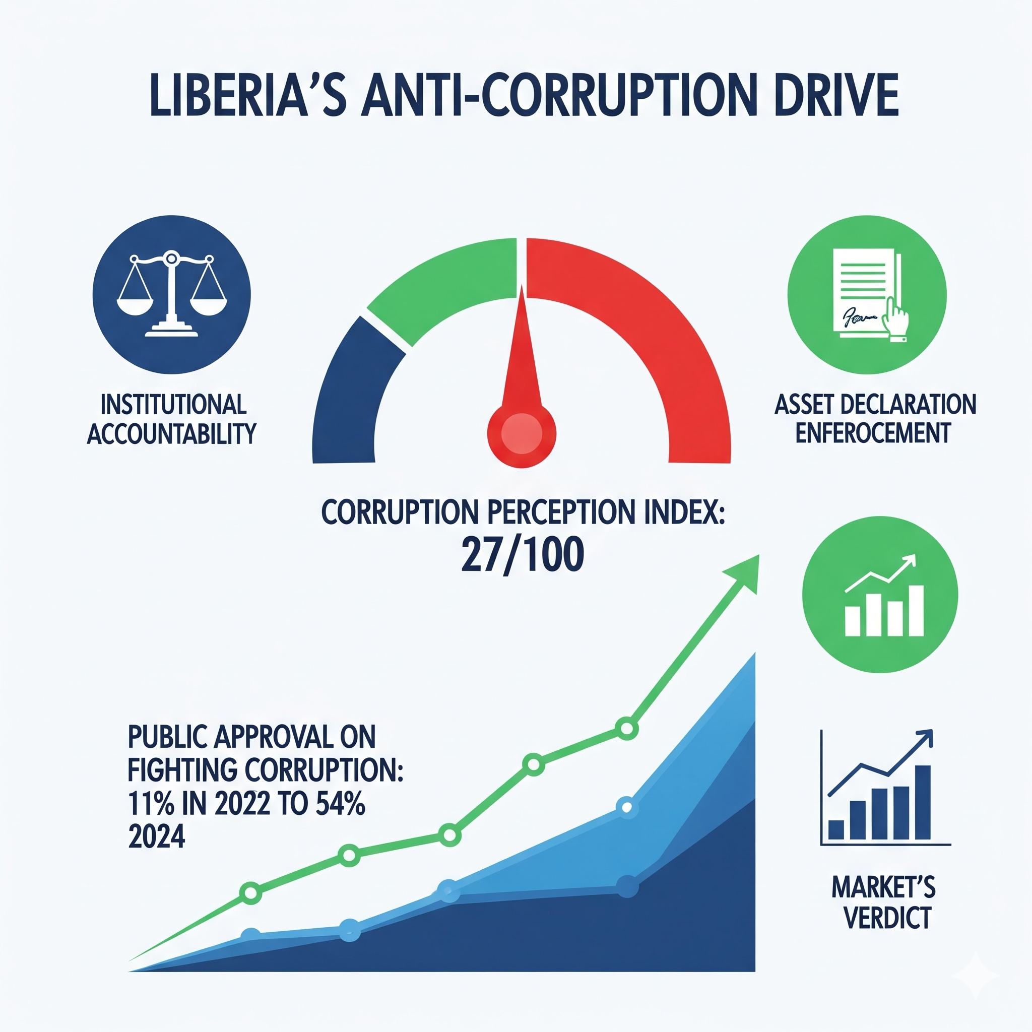 If Liberia wants markets to treat today’s anti-corruption drive as more than headlines, it has to show numbers that travel. On the governance side, the baseline is still low: Liberia’s CPI score is 27/100 for 2024—an improvement, but one that keeps the country deep in the global bottom quartile. That’s the “level.” The “direction” is stronger in public opinion: Afrobarometer reports a jump to 54% of citizens saying the government is doing fairly/very well fighting corruption, up 43 points since 2022, which signals political space for tougher enforcement and systems fixes. Markets will discount the optimism until the enforcement produces visible case maturation and recovered assets, but the swing in sentiment is a forward signal you can’t ignore.